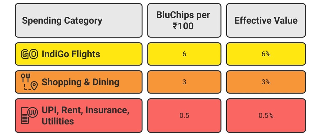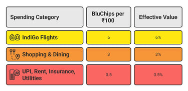 Other spends vary wildly. Groceries and shopping: 3 BluChips per ₹100. UPI, rent, utilities, insurance: just 0.5 BluChips per ₹100. That half-percent rate kills most of your everyday rewards.
